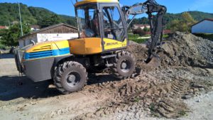 Activité : Conduite pelle à pneu MECALAC. Réalisation de tranchées, prise et dépose de palettes de bordures, enlèvement d’une clôture en lisse béton