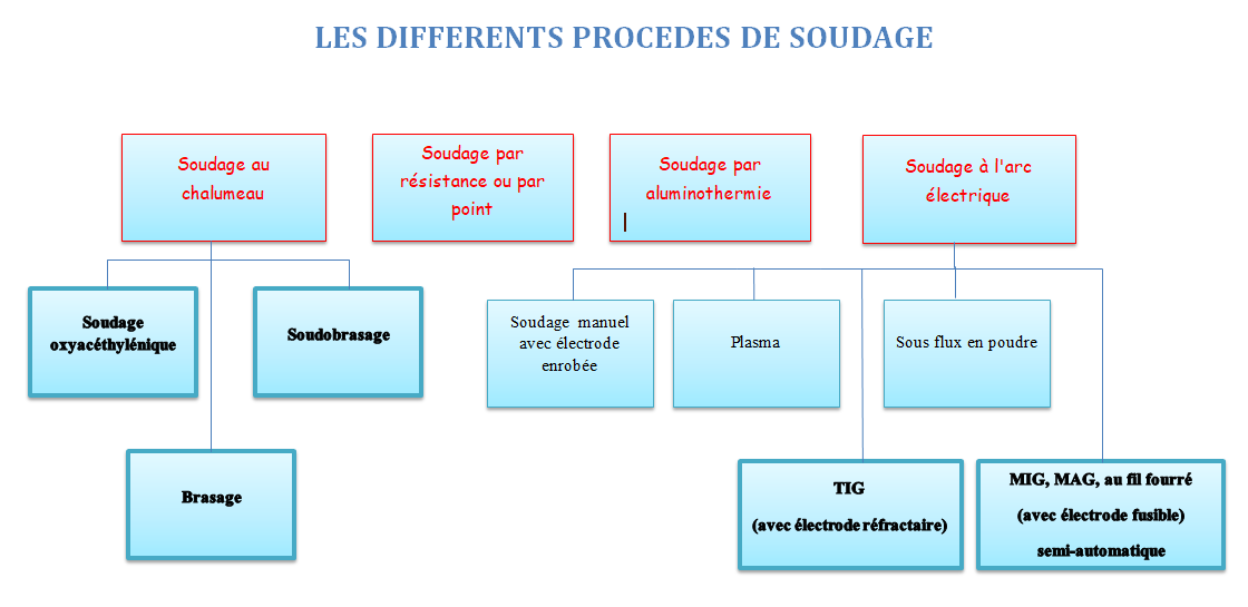 | Soudure oxyacétylénique au chalumeau Soudure à l’arc Brasure et soudo-brasure |