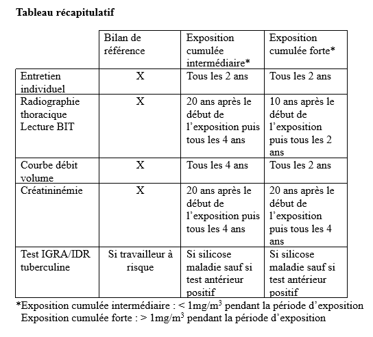 - 20 ans après le début de l’exposition et renouvelée tous les 4 ans en cas d’exposition cumulée intermédiaire : < 1mg/m3