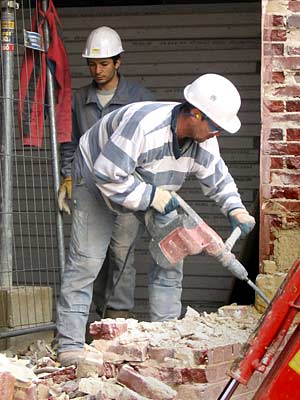 • A l’issue de ce premier tri, abat les structures : mécaniquement : godet de pelles mécaniques ou chargeur, brise roche hydraulique, broyeur ou fraise à béton, grignoteuse, cisaille béton-ferraille …; manuellement : à la masse, à la pioche, à la barre à mine, au marteau piqueur, tronçonneuse…; par pyrotechnie (explosifs) ou des techniques spécialisées (démolition par expansion, croquage (par manque de place au sol : utilisation de robots électriques télécommandes avec pince hydraulique), vérinage (démolition par vérins hydrauliques provoquant l’effondrement sur lui-même du bâtiment) ; découpage mécanique : chalumeau, lance thermique ; traction sur câble…).